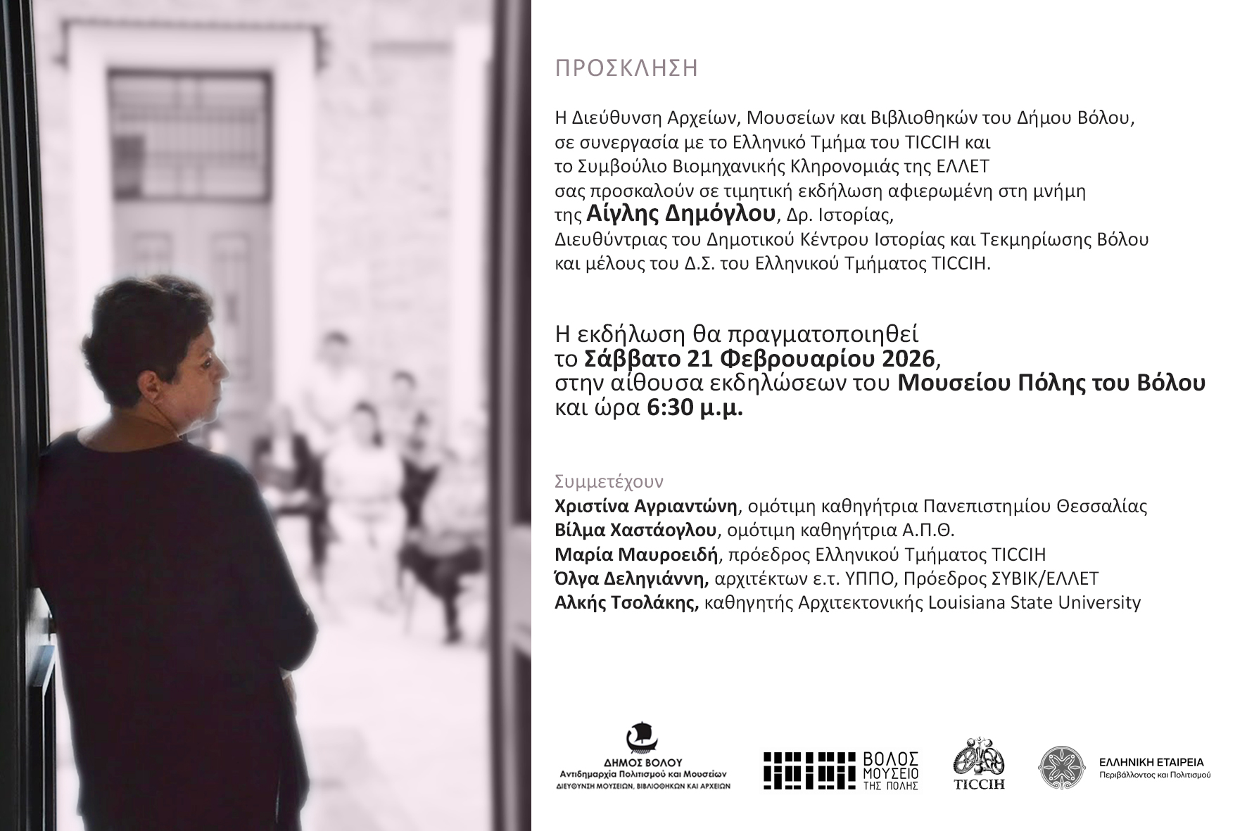 που διοργανώνει η Διεύθυνση Αρχείων, Μουσείων και Βιβλιοθηκών του Δήμου Βόλου σε συνεργασία με το Ελληνικό Τμήμα ΤΙCCIH και το ΣΥΒΙΚ της ΕΛΛΕΤ το Σάββατο 21 Φεβρουαρίου 2026 και ώρα 18.30 στην αίθουσα εκδηλώσεων του Μουσείου Πόλης του Βόλου.
