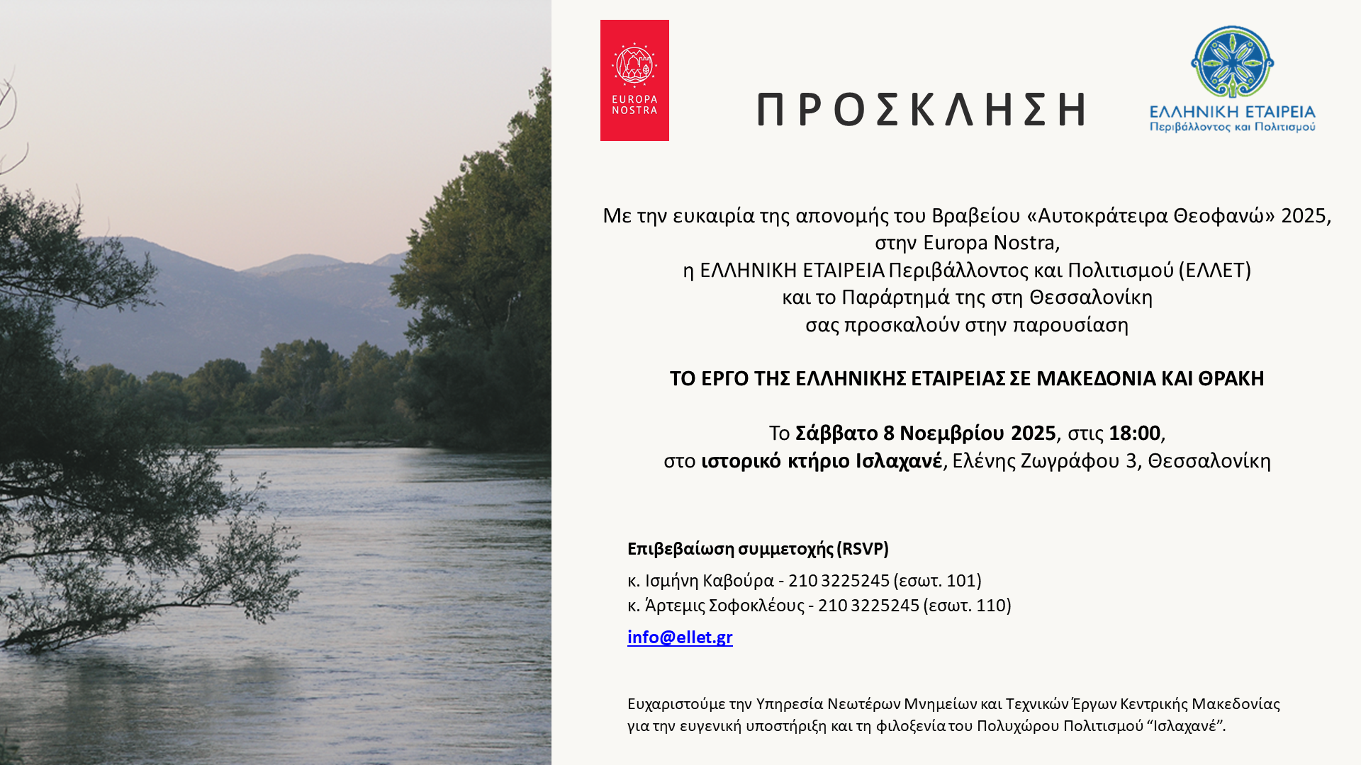 “ΤΟ ΕΡΓΟ ΤΗΣ ΕΛΛΗΝΙΚΗΣ ΕΤΑΙΡΕΙΑΣ ΣΕ ΜΑΚΕΔΟΝΙΑ ΚΑΙ ΘΡΑΚΗ” το Σάββατο 8 Νοεμβρίου 2025, στις 18:00, στο ιστορικό κτίριο – Πολυχώρο Πολιτισμού «Ισλαχανέ», στη Θεσσαλονίκη (οδ. Ελένης Ζωγράφου 3).