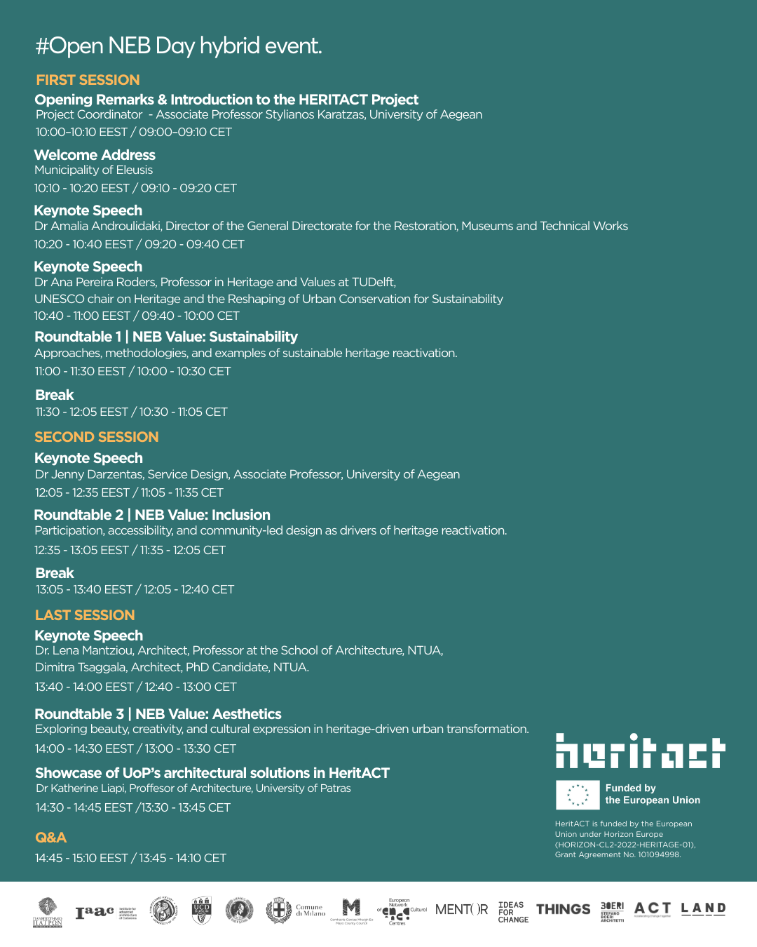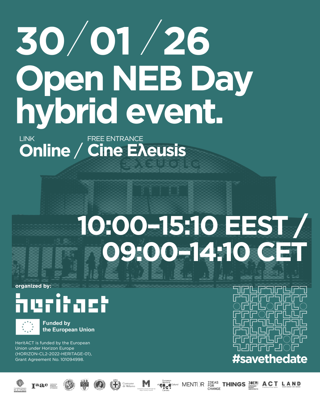 Η εκδήλωση NEB Day στοχεύει να φέρει σε διάλογο φορείς χάραξης πολιτικής, ερευνητές/τριες, πολιτιστικούς οργανισμούς και τοπικές κοινότητες, διερευνώντας πώς το New European Bauhaus μπορεί να συμβάλει στην επανενεργοποίηση της πολιτιστικής κληρονομιάς στην Ευρώπη. Μέσα από κεντρικές ομιλίες και θεματικές στρογγυλές τράπεζες για τη Βιωσιμότητα, την Αισθητική και τη Συμπερίληψη, η εκδήλωση επιχειρεί να αναδείξει καινοτόμες πρακτικές, μεθοδολογίες με επίκεντρο την κοινότητα και τον μετασχηματιστικό ρόλο της αρχιτεκτονικής, του σχεδιασμού και των συμμετοχικών πρακτικών στη διαμόρφωση πιο ανθεκτικών, όμορφων και ανθρωποκεντρικών χώρων κληρονομιάς.
